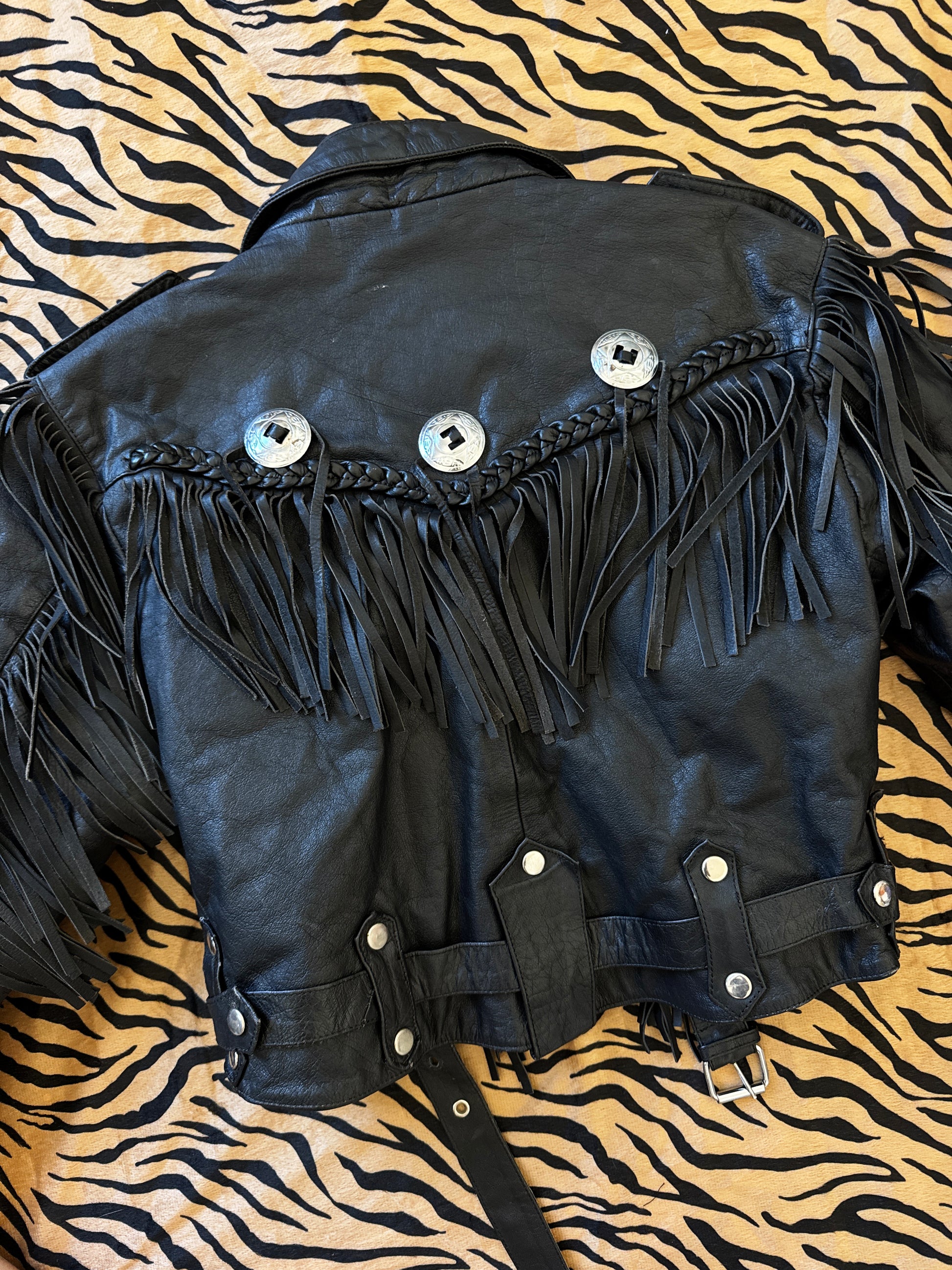 Vintage Black Leather Fringe Concho Jacket. Womens Size Medium Best. Marked A Large. Genuine Leather. Great Condition - See All Photos.