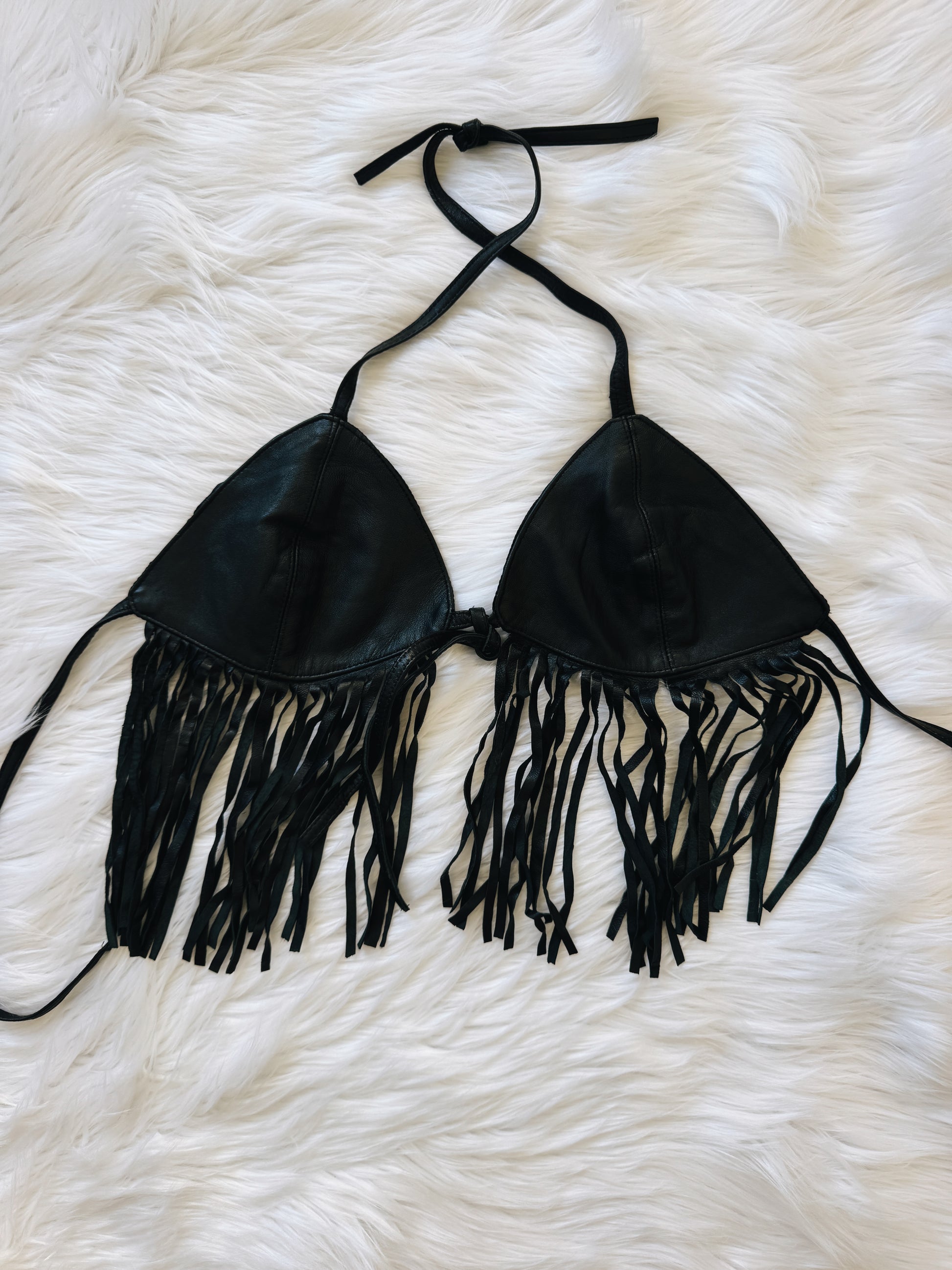 Vintage Black Leather Fringe Halter Top. Size Small - Medium Best. All Straps Adjustable. Genuine Leather, Great Condition See Photos.