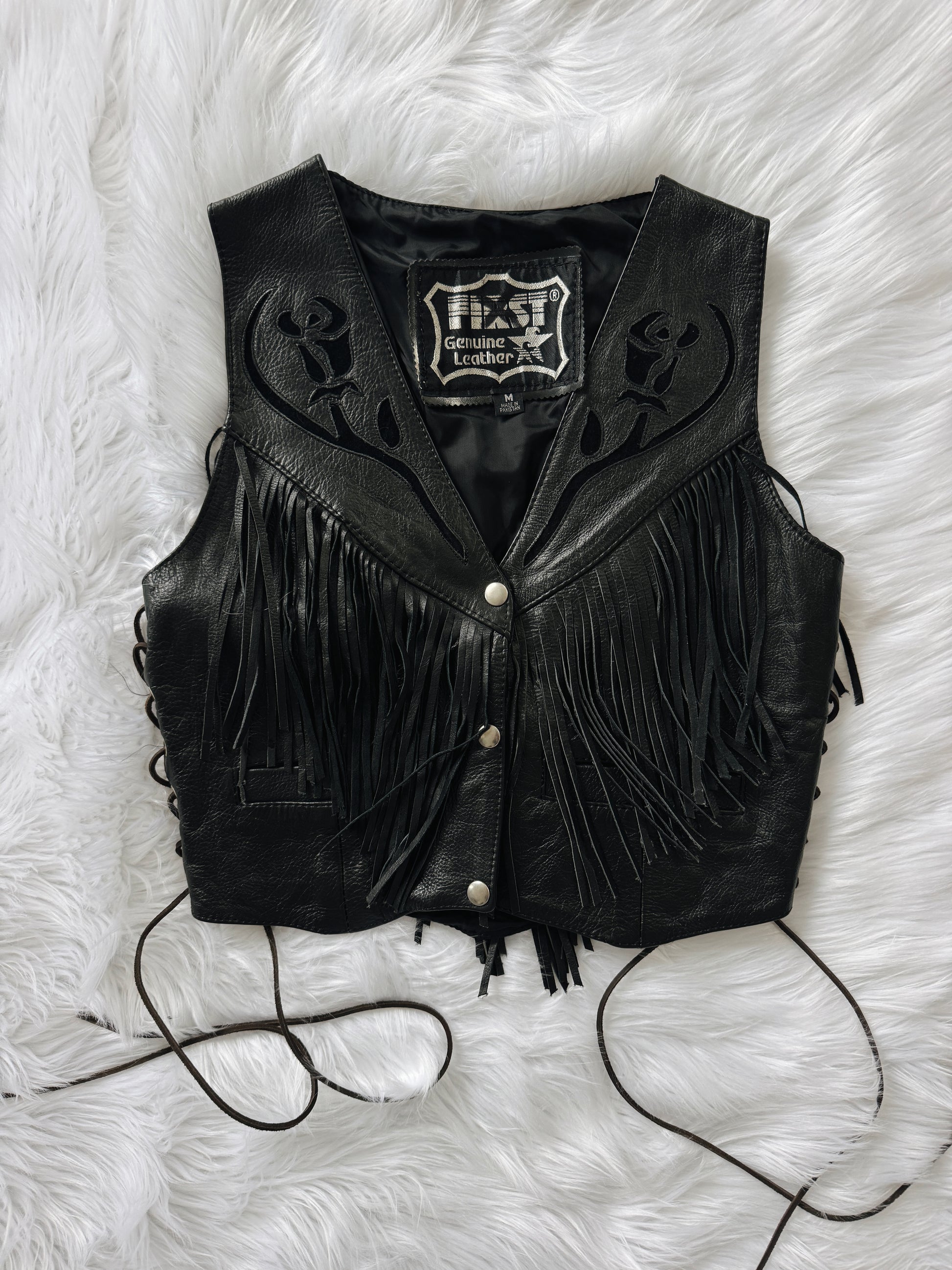 Vintage Black Rose Leather Fringe Vest. Size Medium. Genuine Leather. Great Condition See Photos.