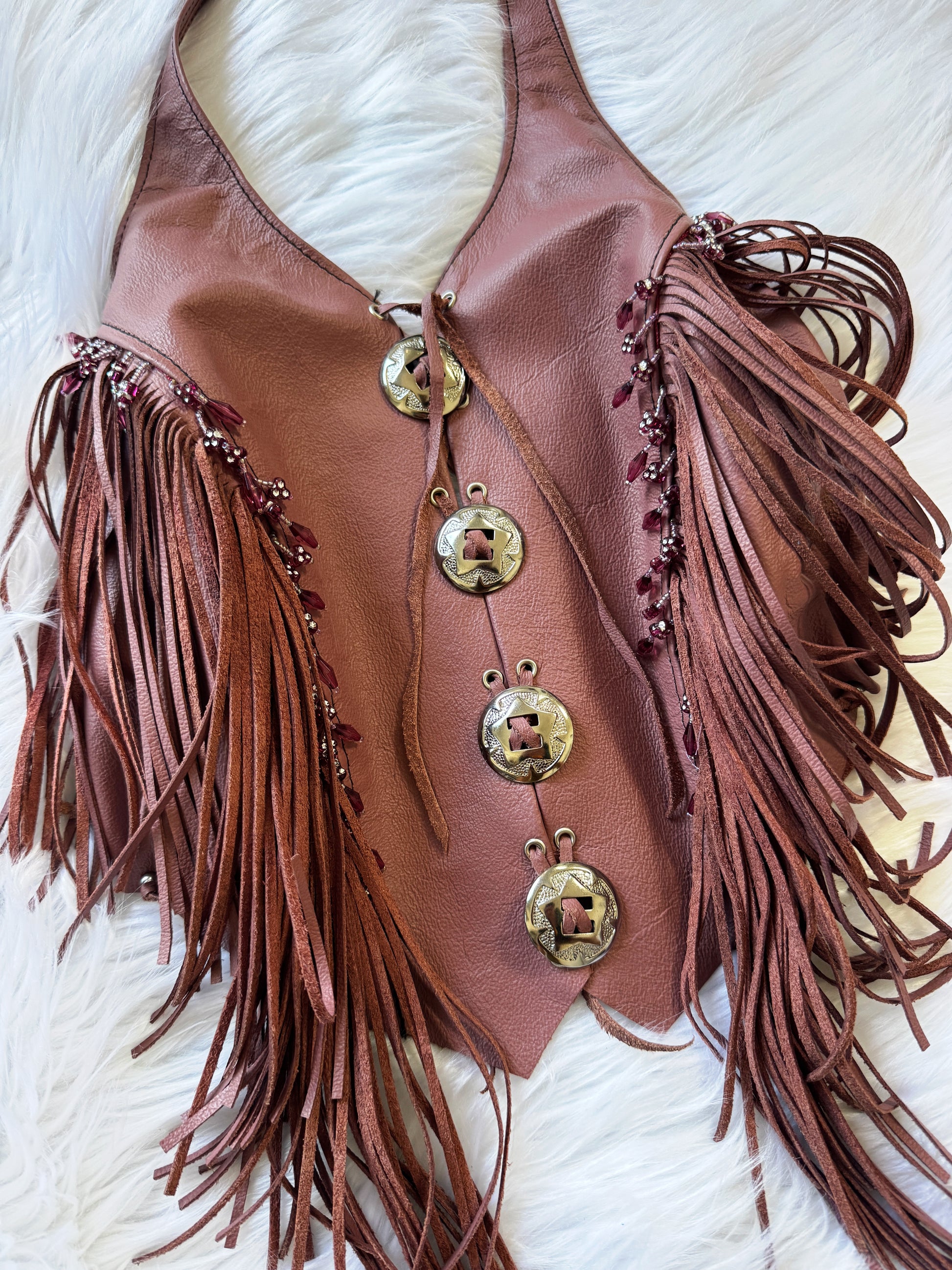 Vintage Dusty Rose Fringe Leather Top. All Straps Adjustable. Womens Size Small - Large. Genuine Leather. Great Condition See Photos.