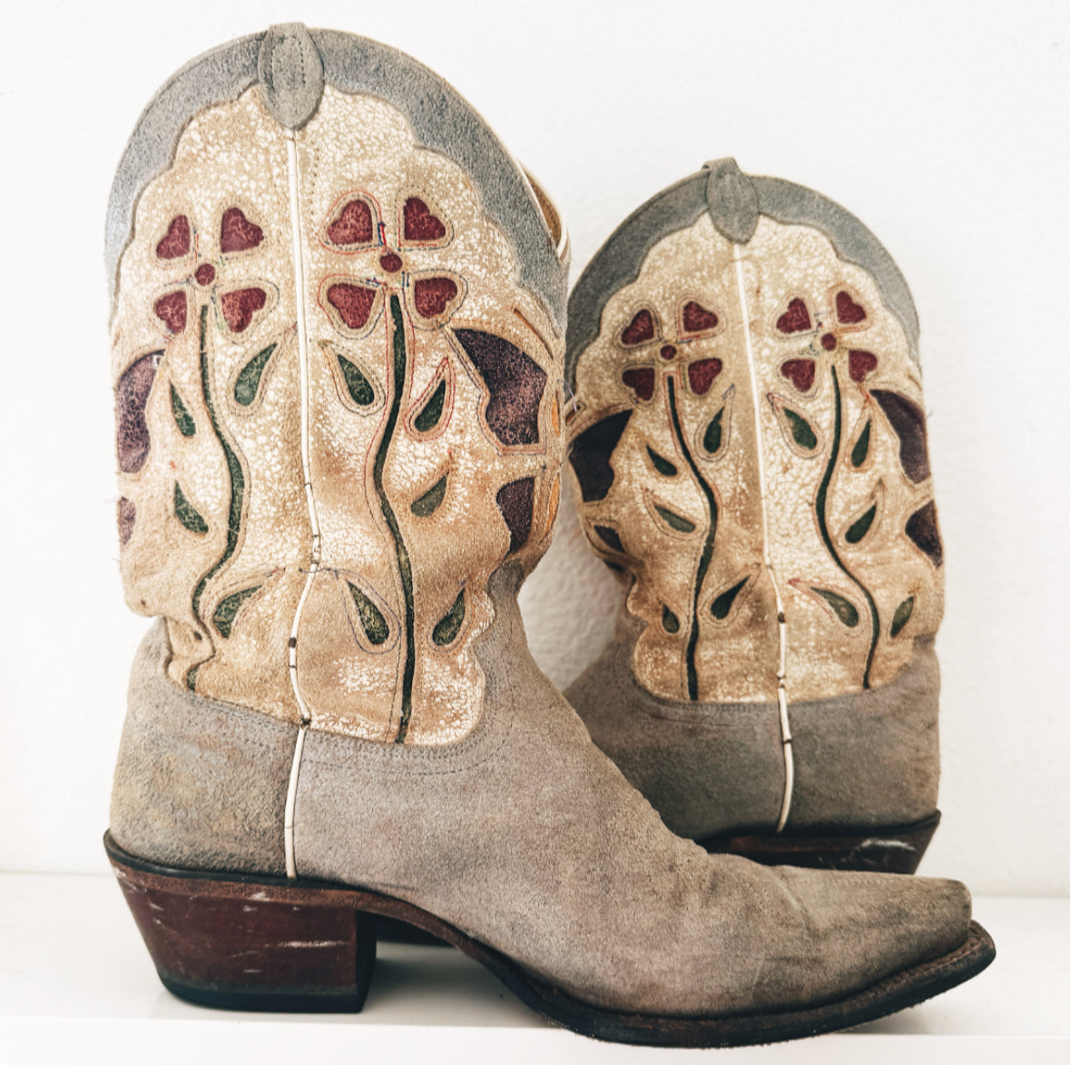 Vintage Rare Justin Floral Inlay Cowboy Boots. Womens Size 8. Genuine Leather Suede. Made In USA. Great Condition, Vintage Wear Could Need Some Cleaning.