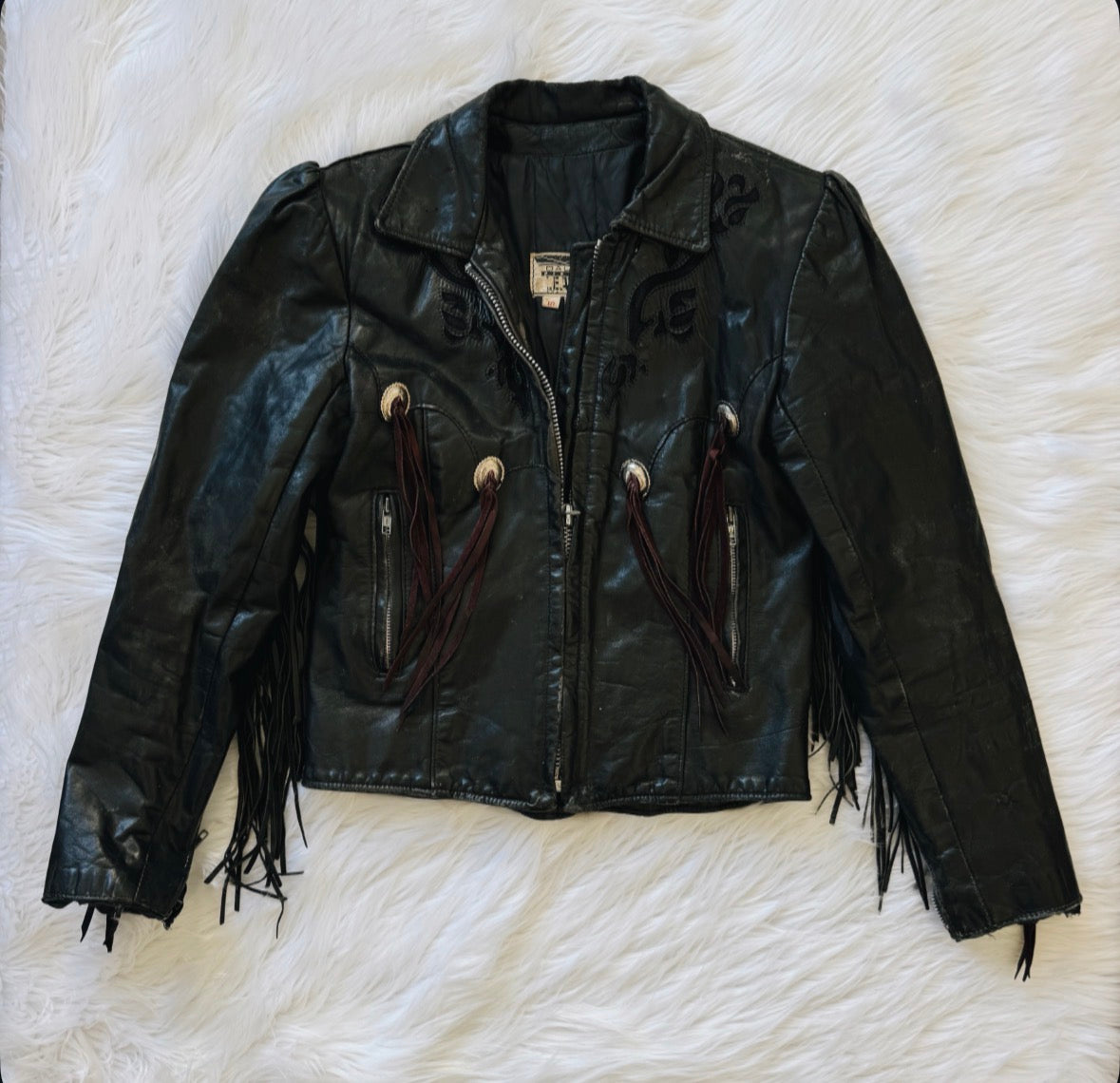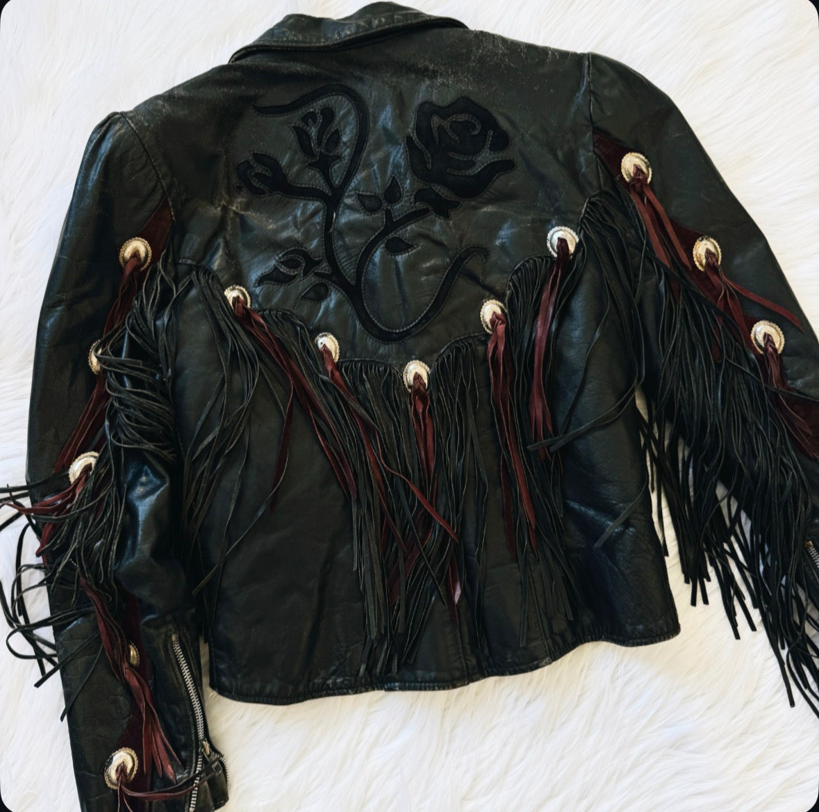 Vintage Leather Black & Red Rose Fringe Jacket. Womens Size 10, Fits Like A Medium. Genuine Leather. Great Condition Leather Cracked In One Spot On Back Shoulder See Photos.