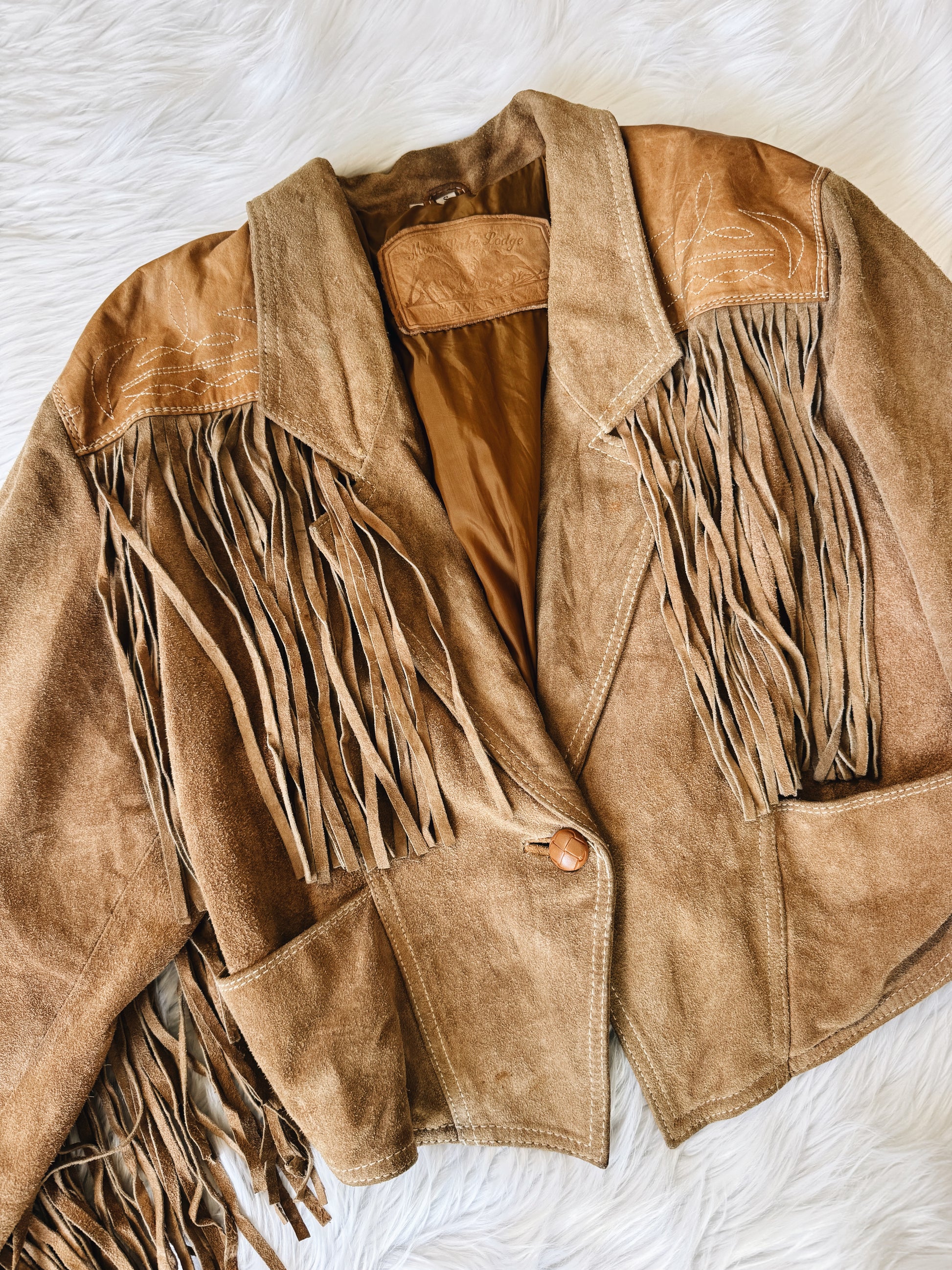Vintage Tan Fringe Leather Suede Jacket W/ Stitching. Womens Size Small - Medium Best. Great Condition Some Wear See Photos.