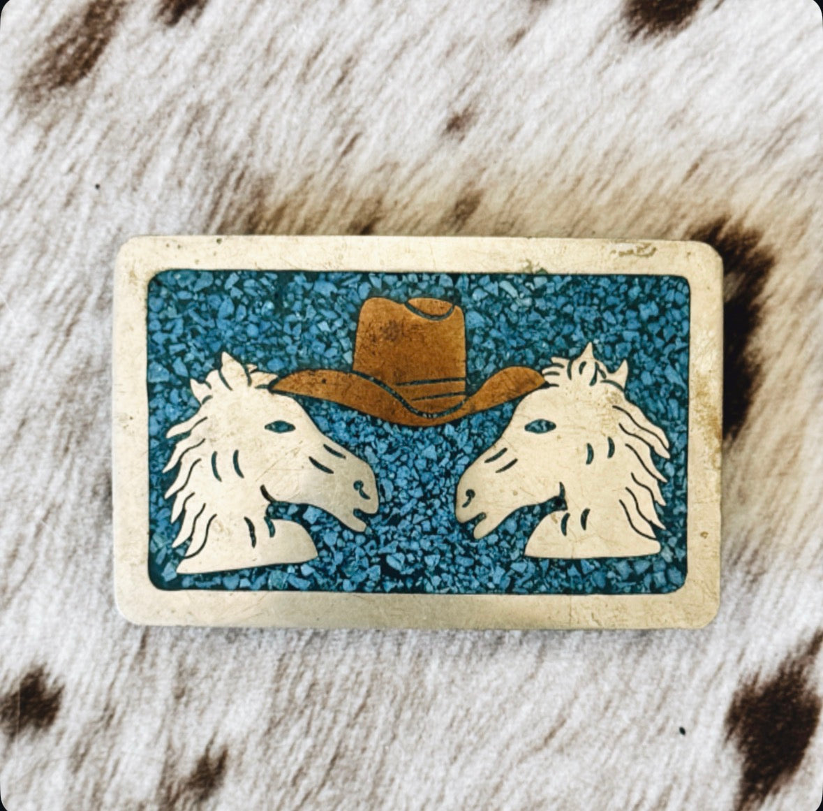 Vintage Turquoise Horses & Cowboy Hat Belt Buckle